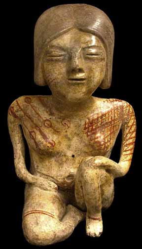 A masterfully detailed Chinesco Type 'E' female figure with original red and black painted decorations on a creamy kaolin slip. The hair is very finely incised, and the overall work is indicative of a specific ancient Nayarit workshop or individual artist who created this sub-style.