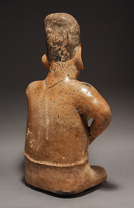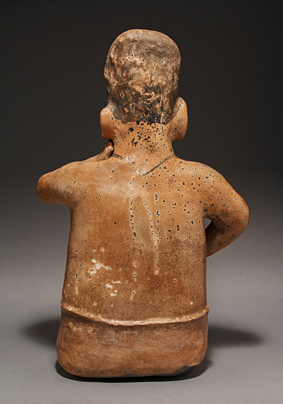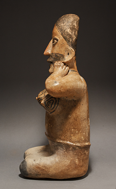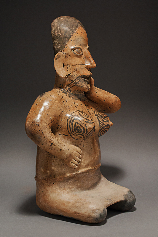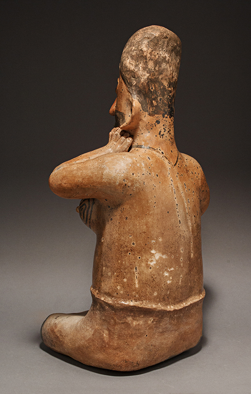 This Jalisco woman, kneeling with one hand on her jaw and the other on her belly, has striking tattooing around her eyes, her neck and intricately designed upon her youthful breasts. She displays a serene expression with lips slightly parted and a blissful gaze. The light brown slip contrasts with the black pigmented headdress and the unslipped buff skirt.