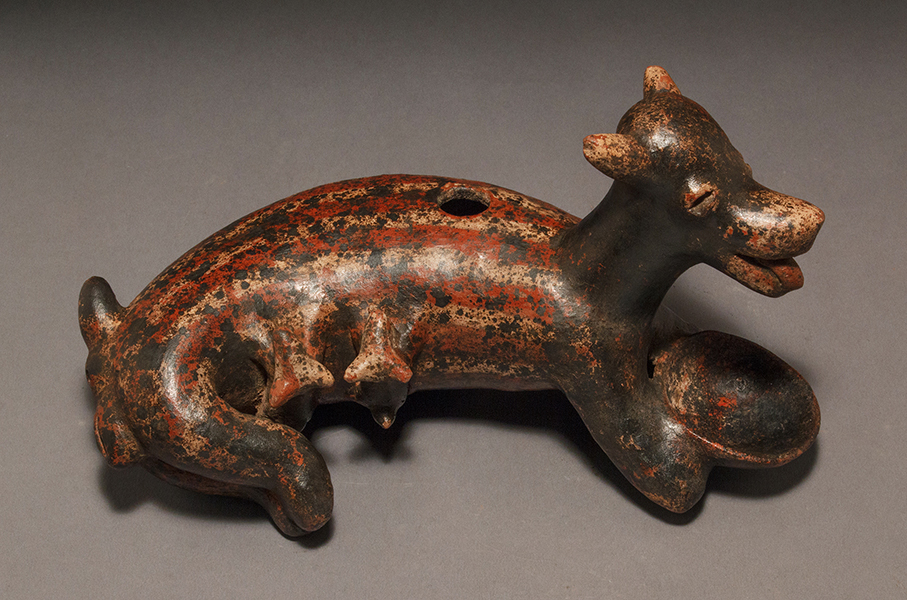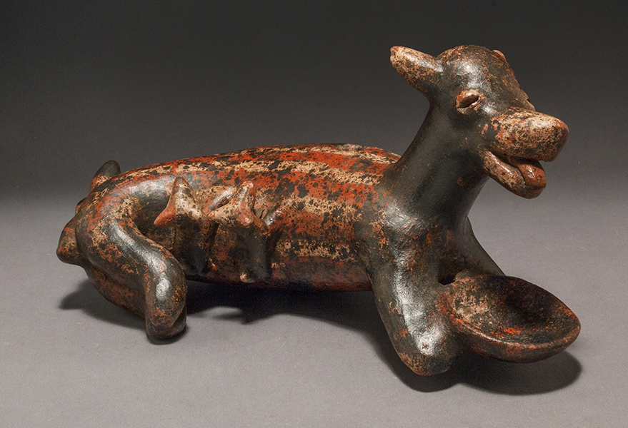 This fine polychrome mother dog, nursing two pups lies curled, adorned with black, cream and red pigments, has her protruding tongue ready for the food or water which will be placed in her bowl.
