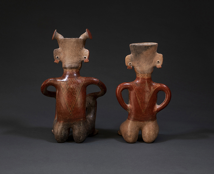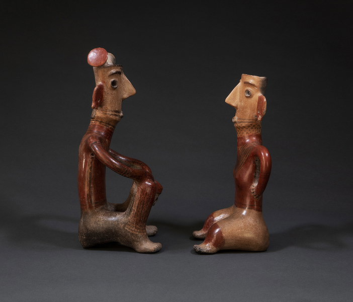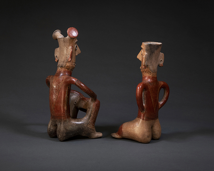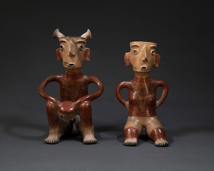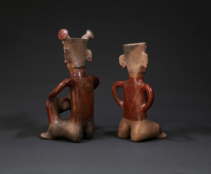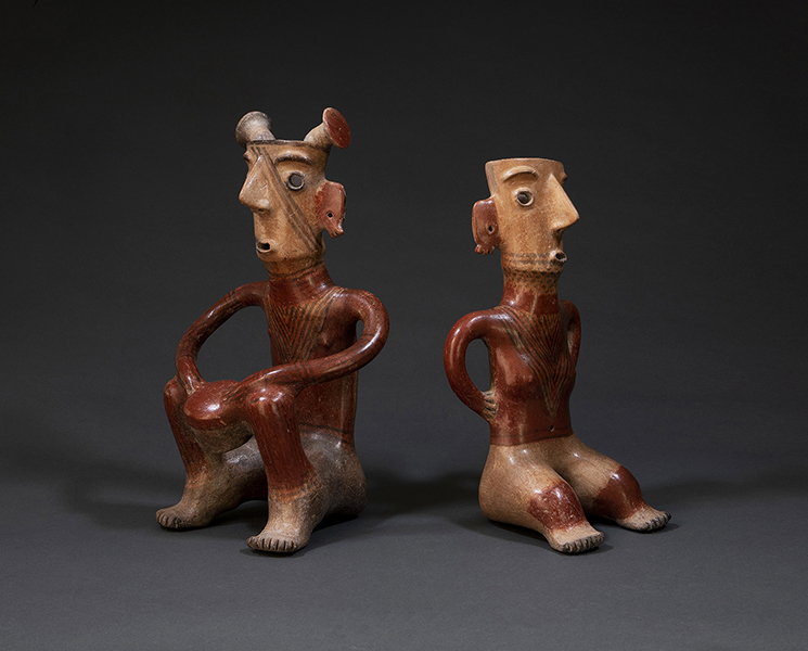 This outstanding pair exhibits the classic characteristics of Zacatecas figures, the female with her arms and hands looped to her waist, her level and open top of her head, the black resist decoration around her neck, the male with the curved horn-like headdress projecting from the top of his open head, and the drum held between his knees. The facts that show that it is a true pair are the identical earrings, the identical chevron-like black decorations on the chests and backs of both figures, the formation of their mouths and eyes are also identical. The red slip is also a match. Most male and female Zacatecas couples are not true pairs. True pairs are exceedingly rare and sought after. P-3801. Height: Male figure is approx. 16 inches (40.6 cm.); The female figure is 14 inches (35.5 cm.)