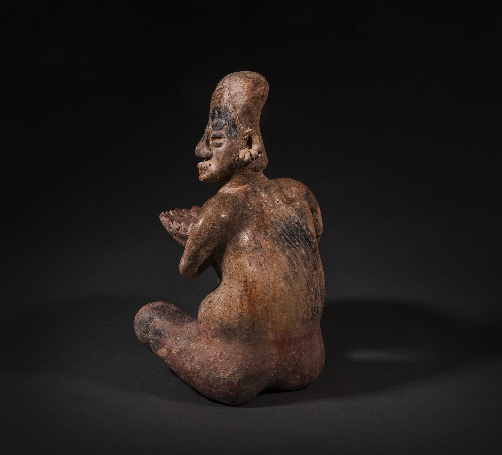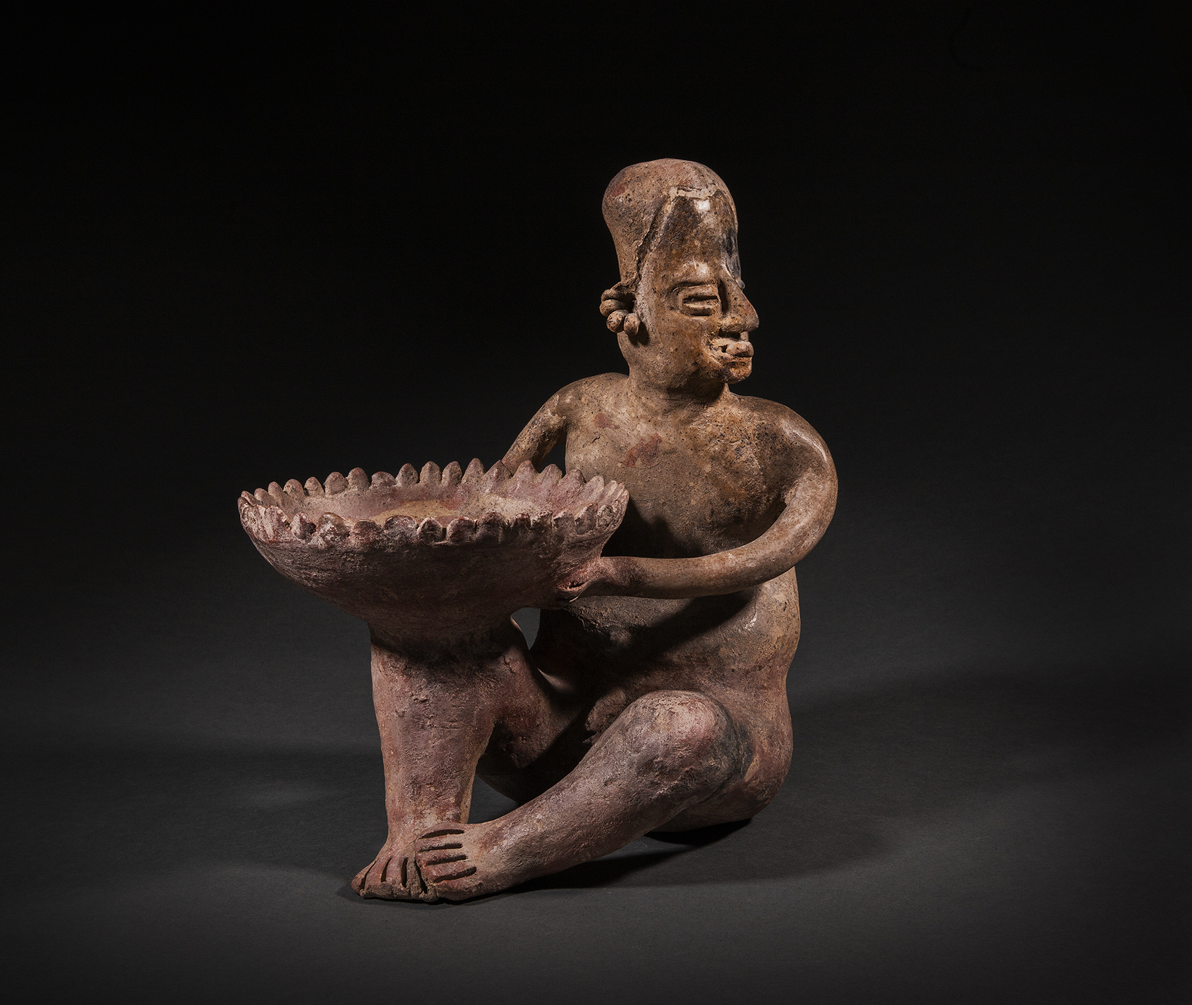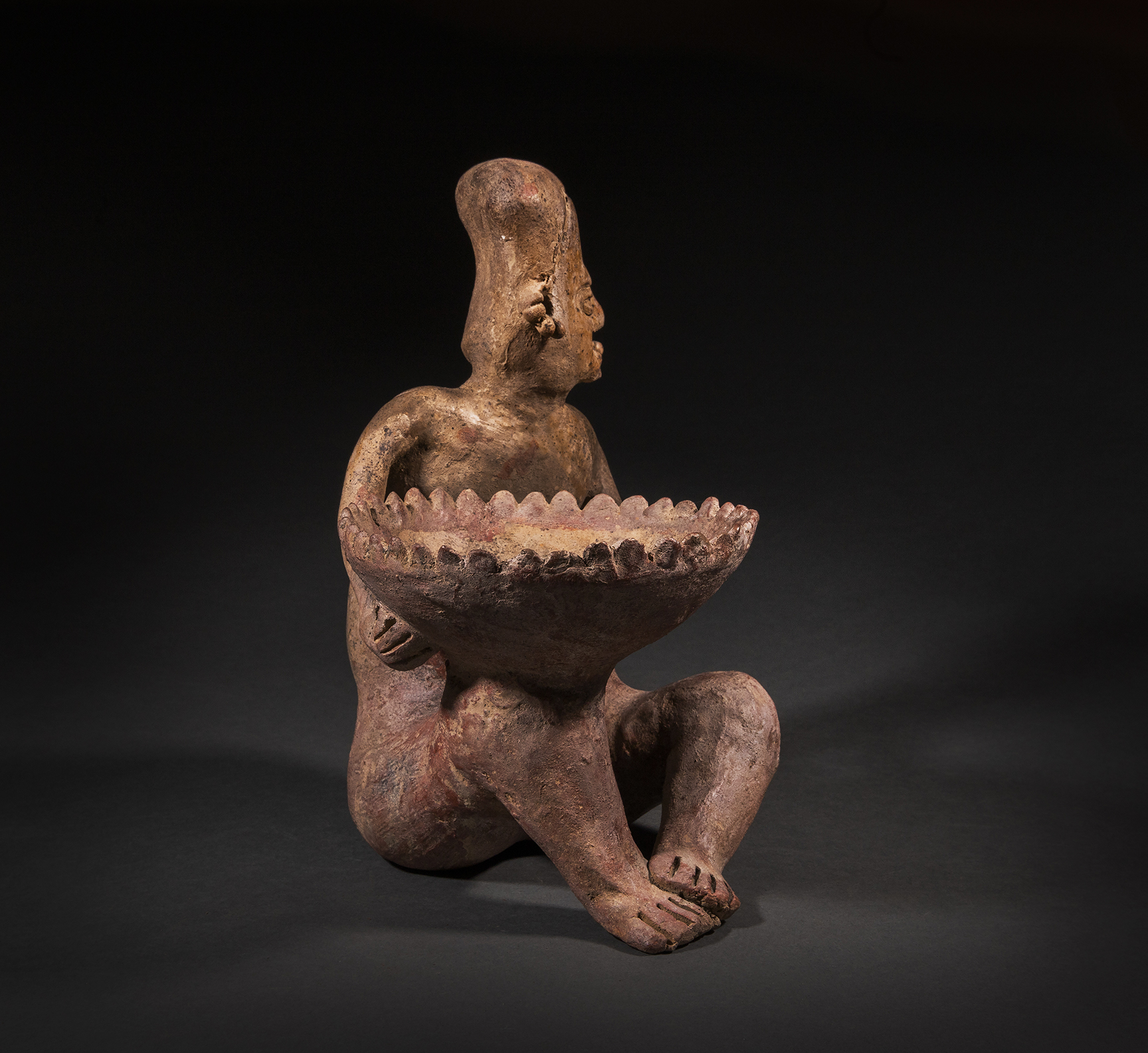 A Jalisco male seated figure holding a large flared bowl surrounded by pointed rim enhancements, balanced on the right knee with both hands. He is nude with his head turned to the left, with an object, perhaps peyote protruding from his mouth- such is the way of the shaman. He wears multi-faceted earrings. Buff clay, with some remains of red paint.