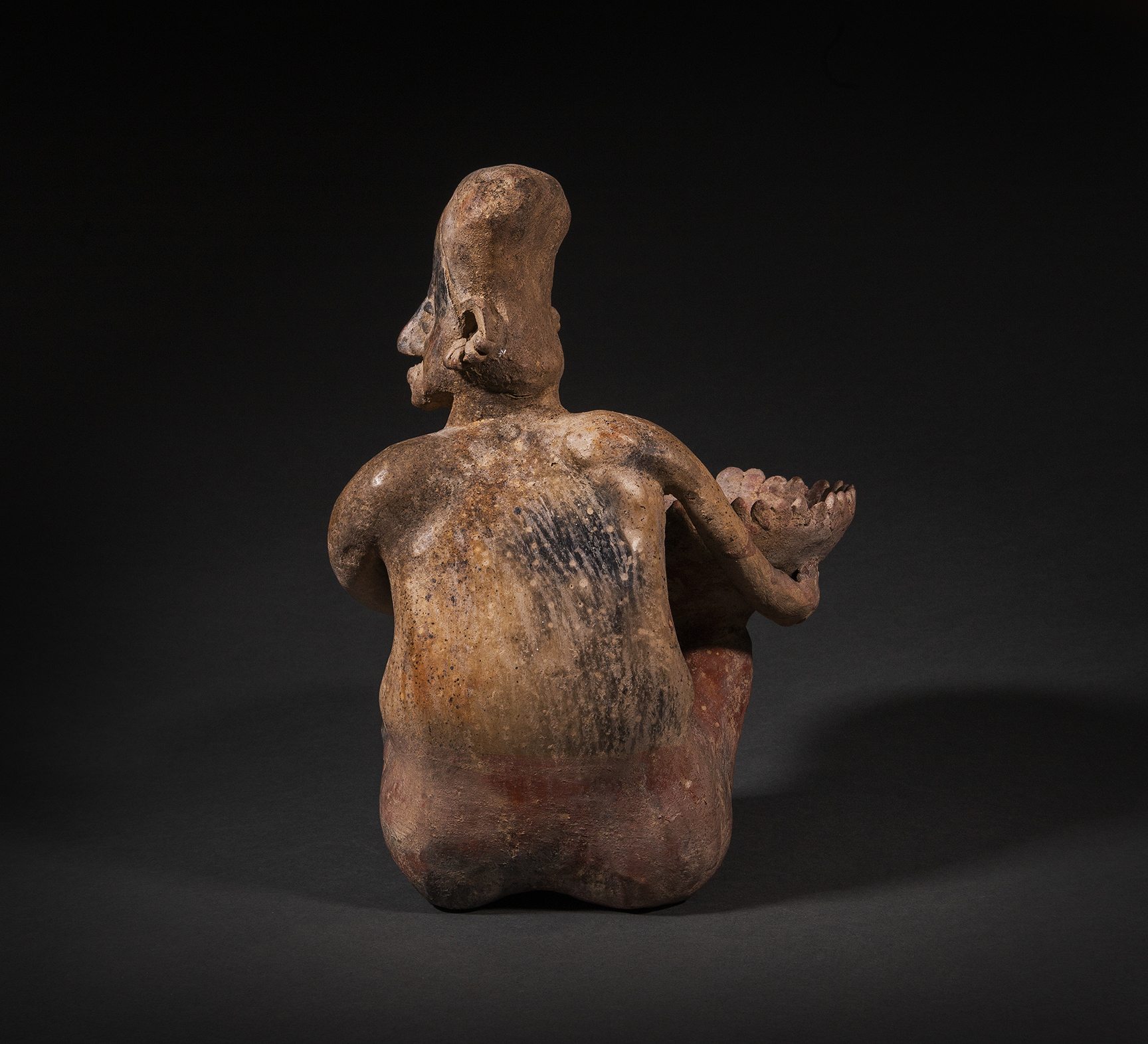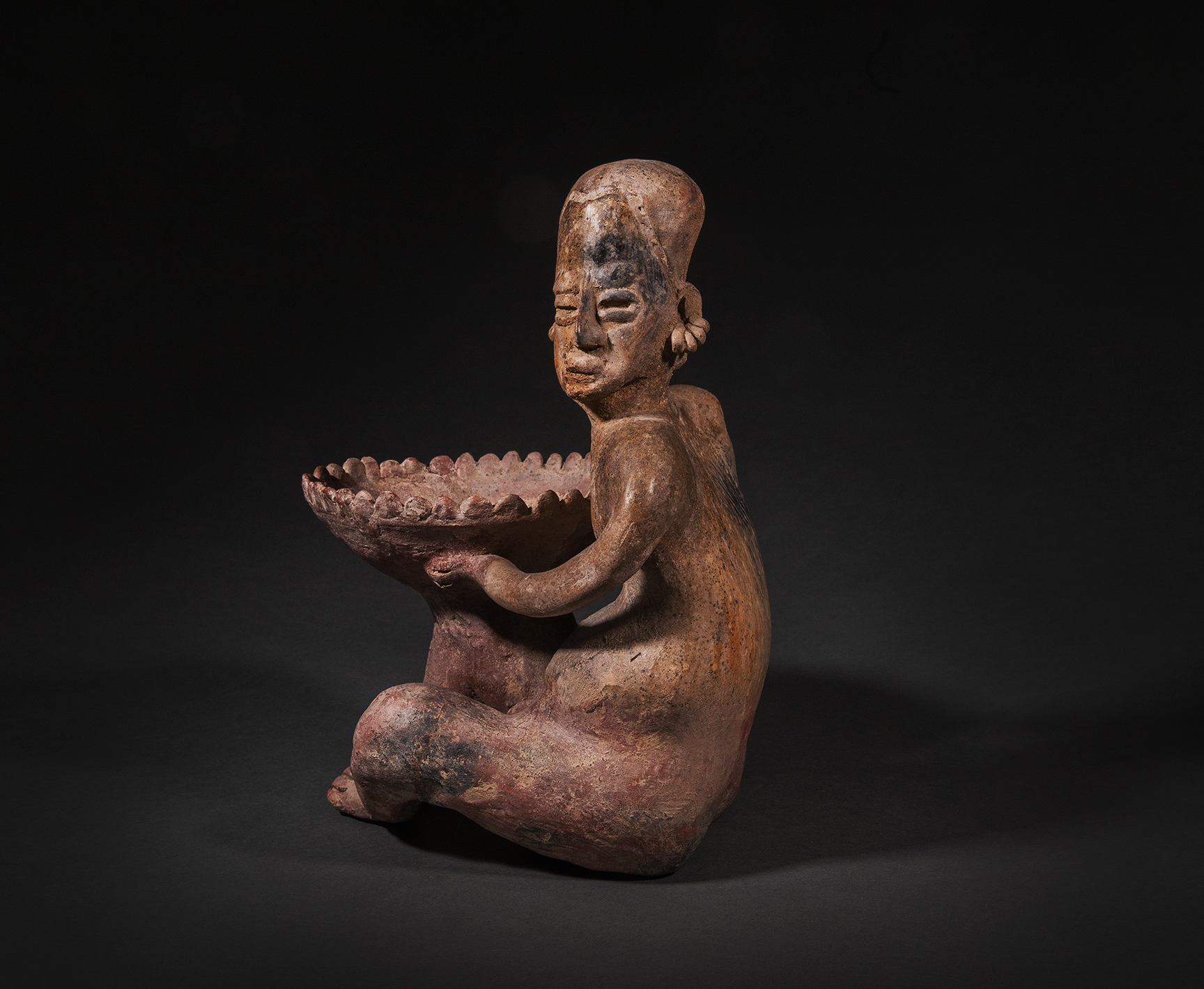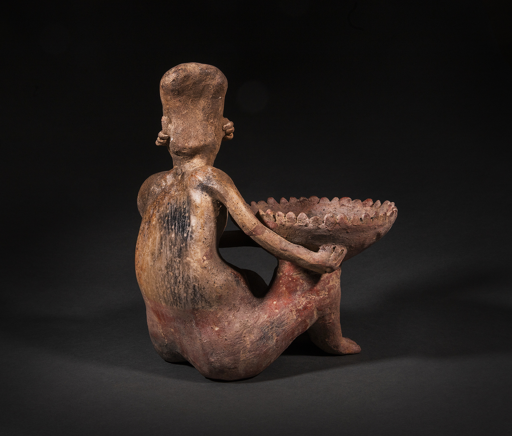 A Jalisco male seated figure holding a large flared bowl surrounded by pointed rim enhancements, balanced on the right knee with both hands. He is nude with his head turned to the left, with an object, perhaps peyote protruding from his mouth- such is the way of the shaman. He wears multi-faceted earrings. Buff clay, with some remains of red paint.