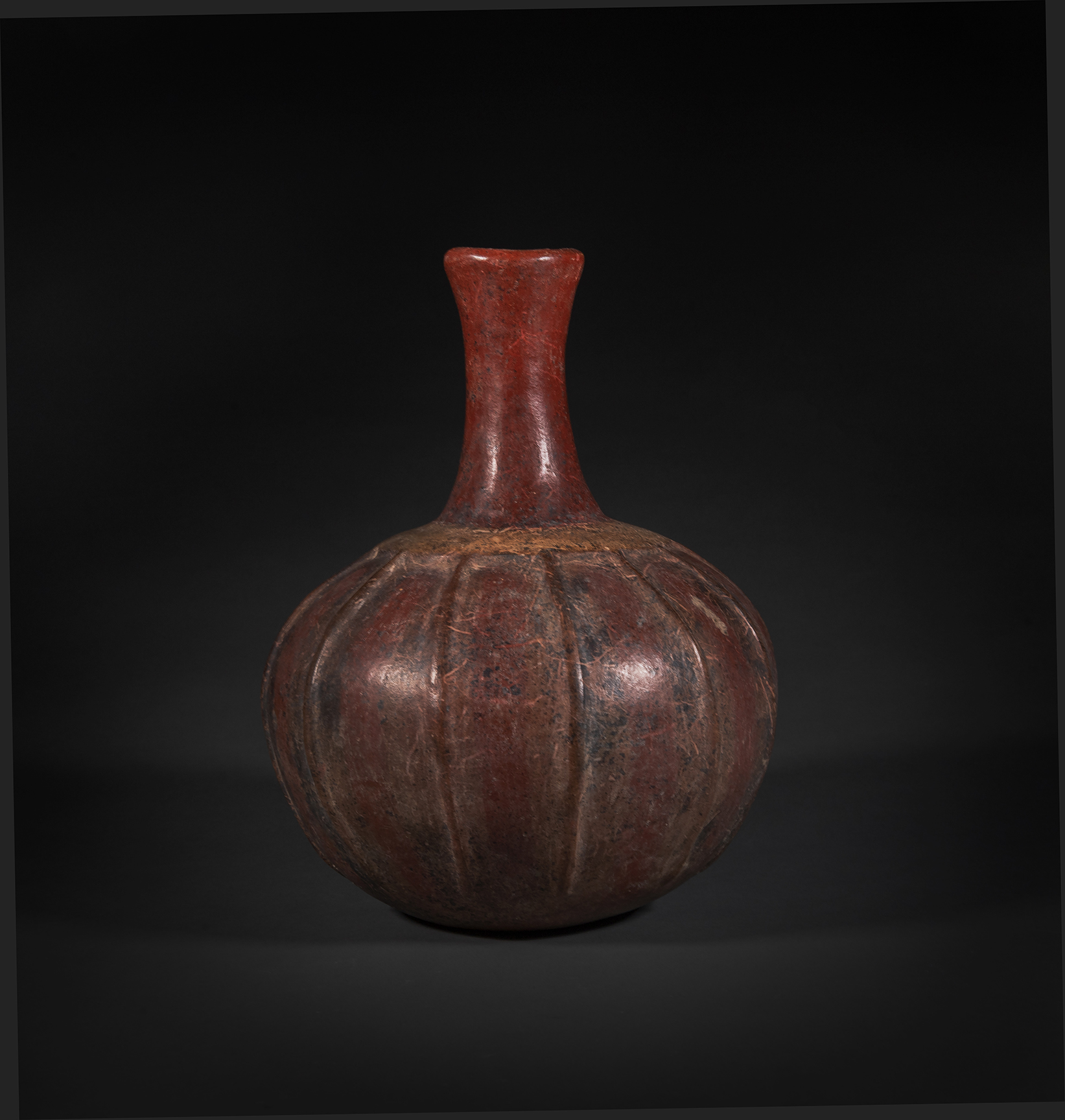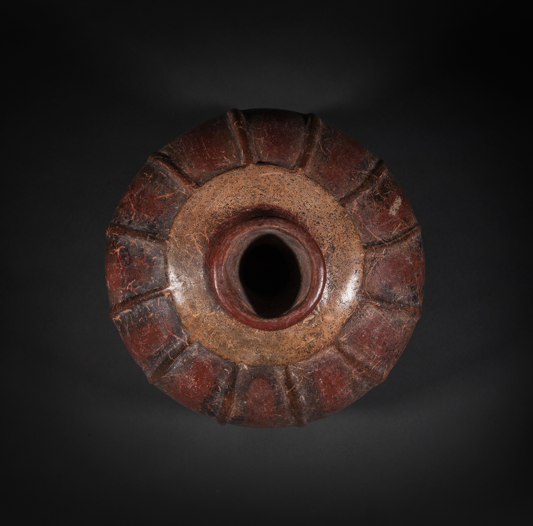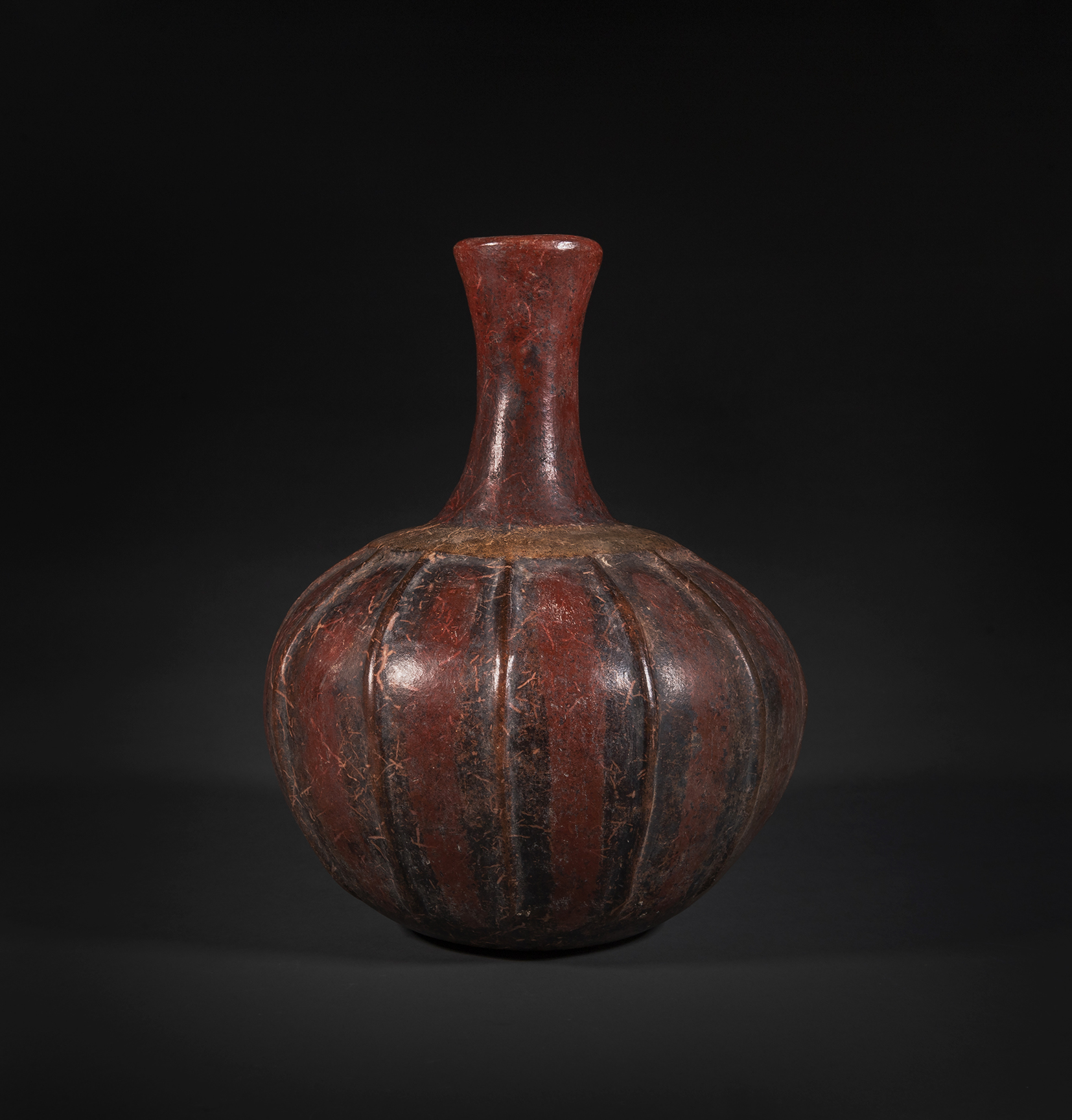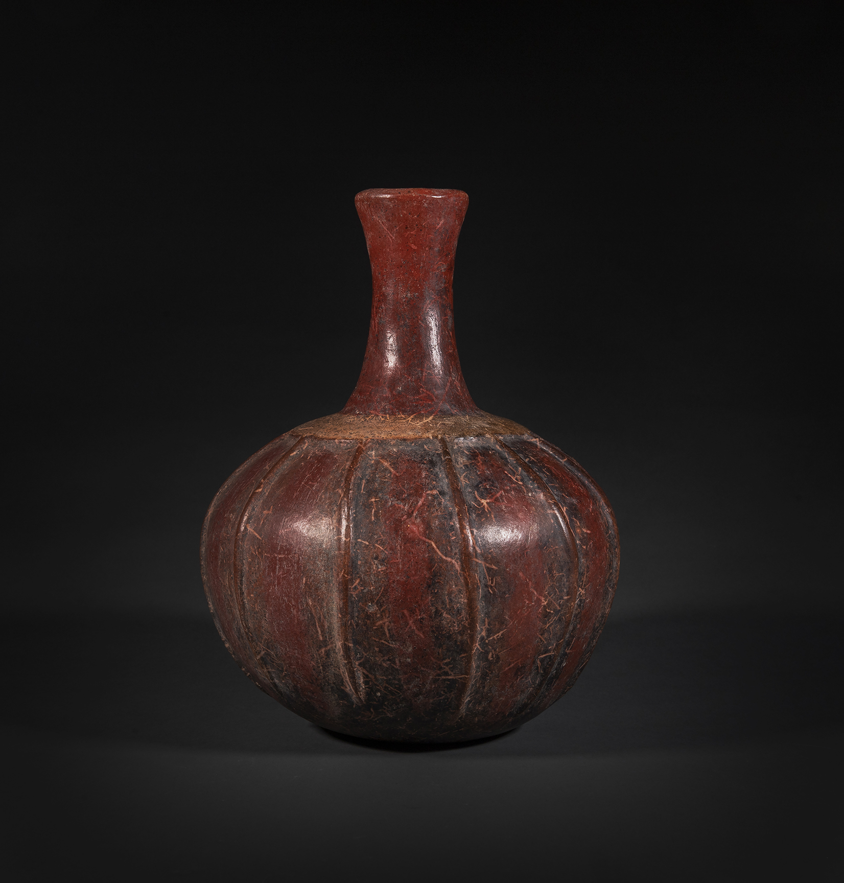 This carved, incised, gadrooned, and pigmented globular vessel, with long neck and three colors, is a handsomely burnished vase with sporadic ancient root markings within the beautiful surface patina.