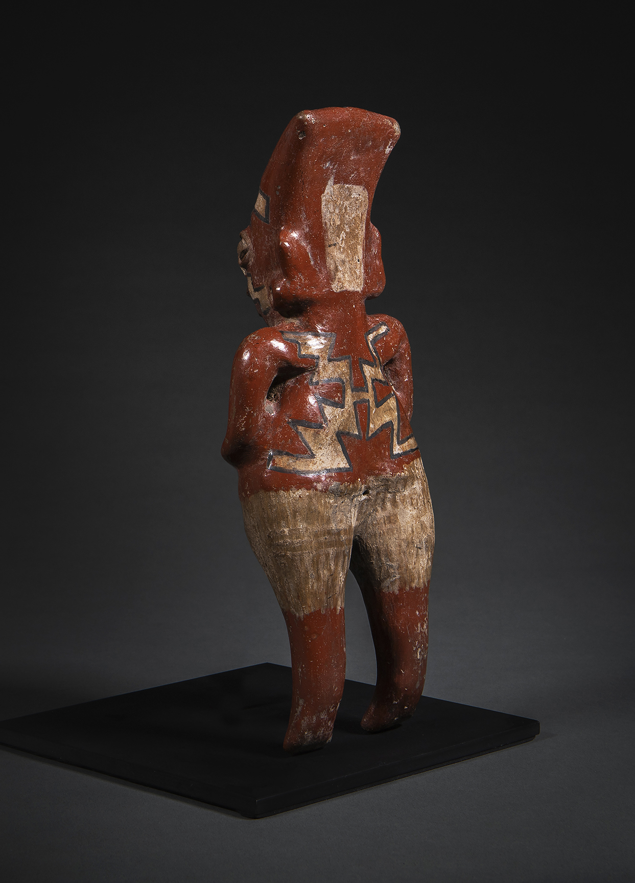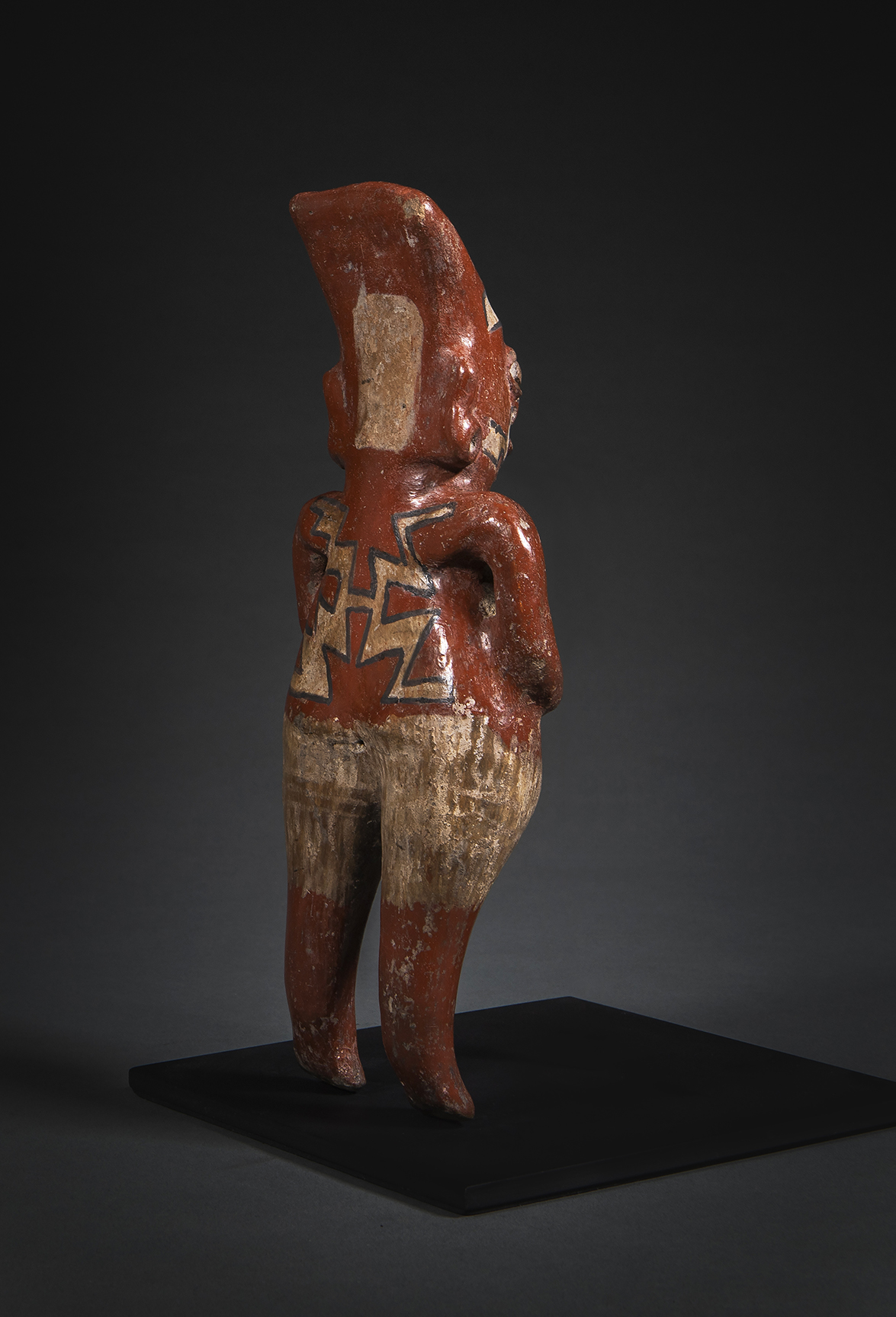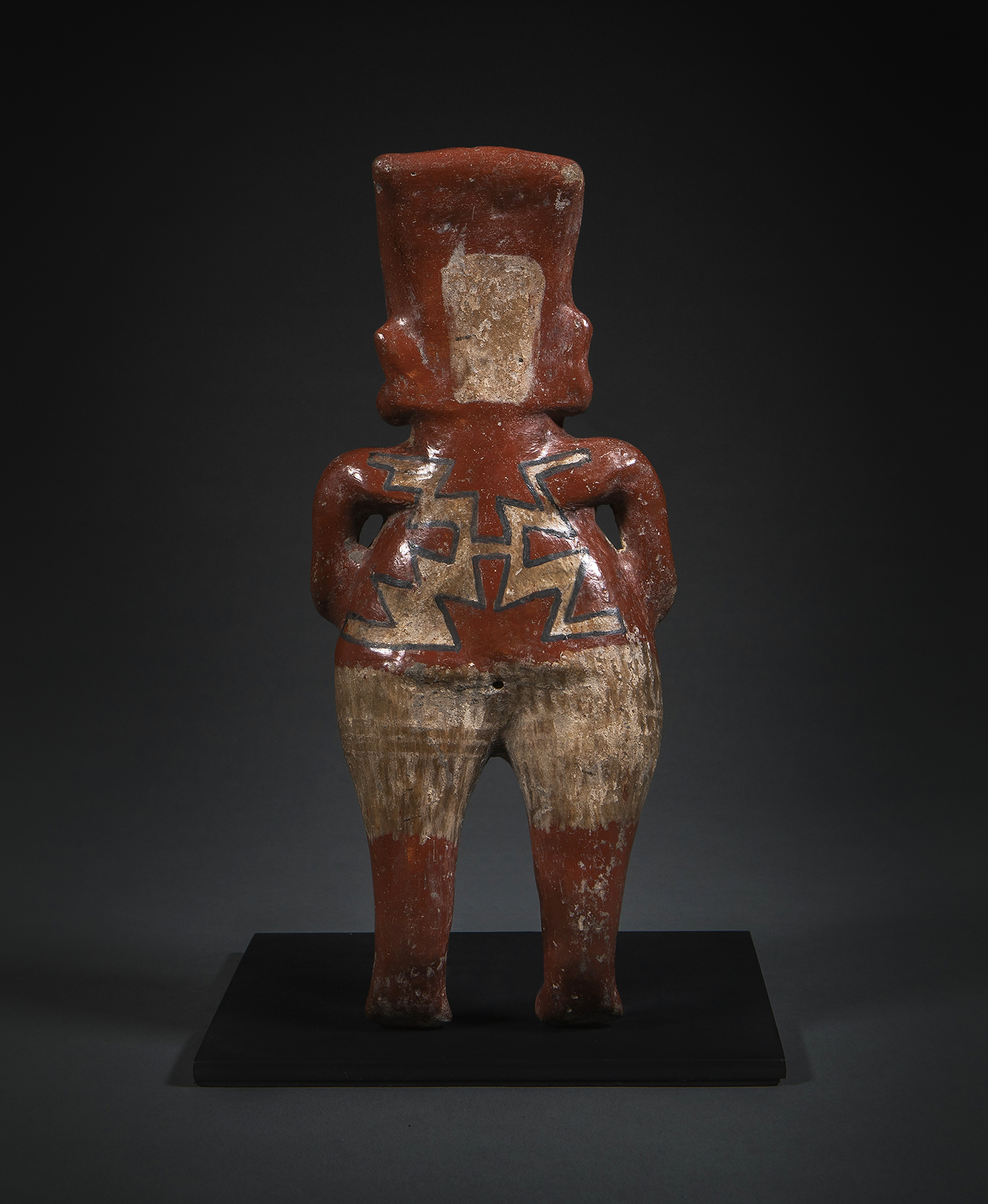 A Superb Chupicuaro Female Standing Figure with excellent red, black, and cream pigment geometric designs, Late Preclassic, ca. 300 B.C.-100 B.C.