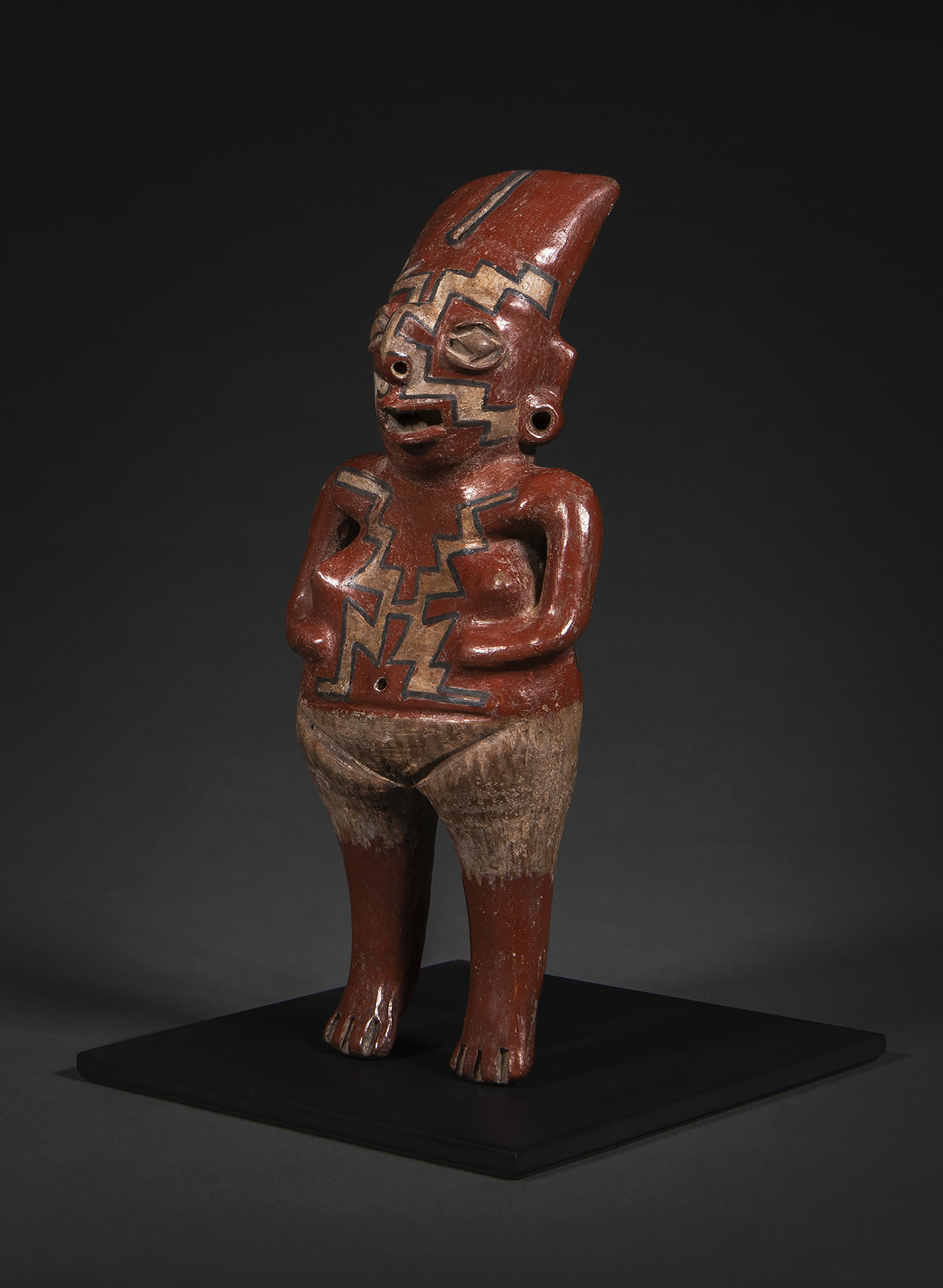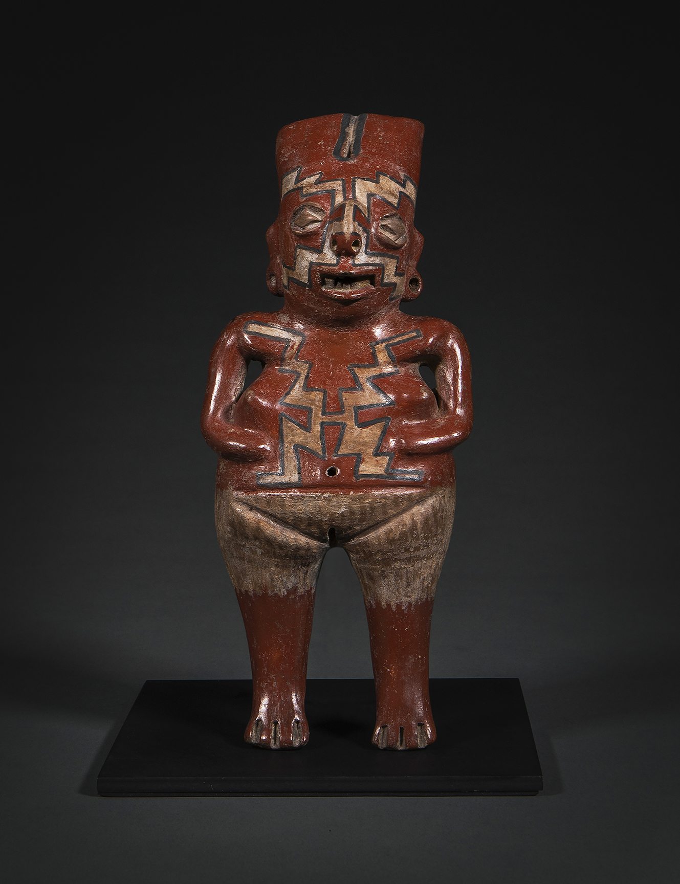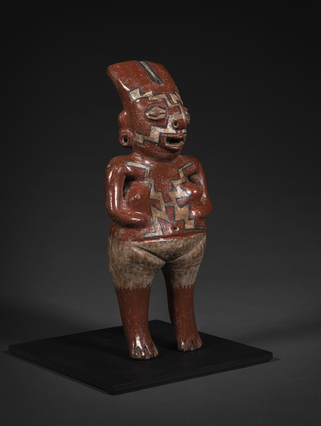 A Superb Chupicuaro Female Standing Figure with excellent red, black, and cream pigment geometric designs, Late Preclassic, ca. 300 B.C.-100 B.C.